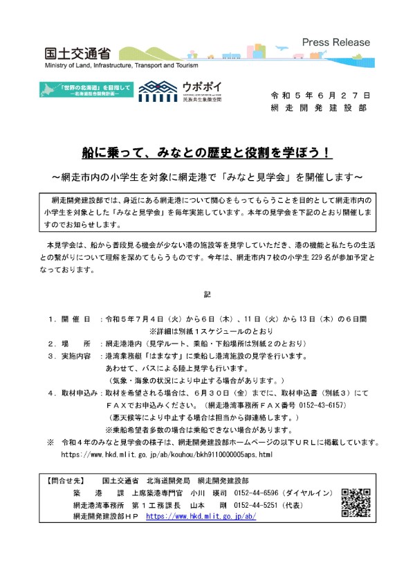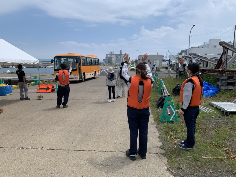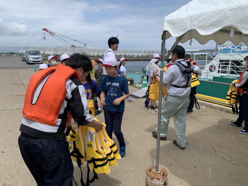 7月11~13日の3日間、網走開発建設部主催「みなと見学会」のお手伝いをしました。 身近にある網走港について関心をもってもらうことを目的としたイベントで、普段見る機会が少ない港の施設等を船から見学することで港の機能と私たちの生活との繋がりについて理解を深めてもらうものです。 今年は網走市内7校の小学生229名が参加し、当社は救命胴衣の装脱着、乗降船時のアシストなどで協力させていただきました。