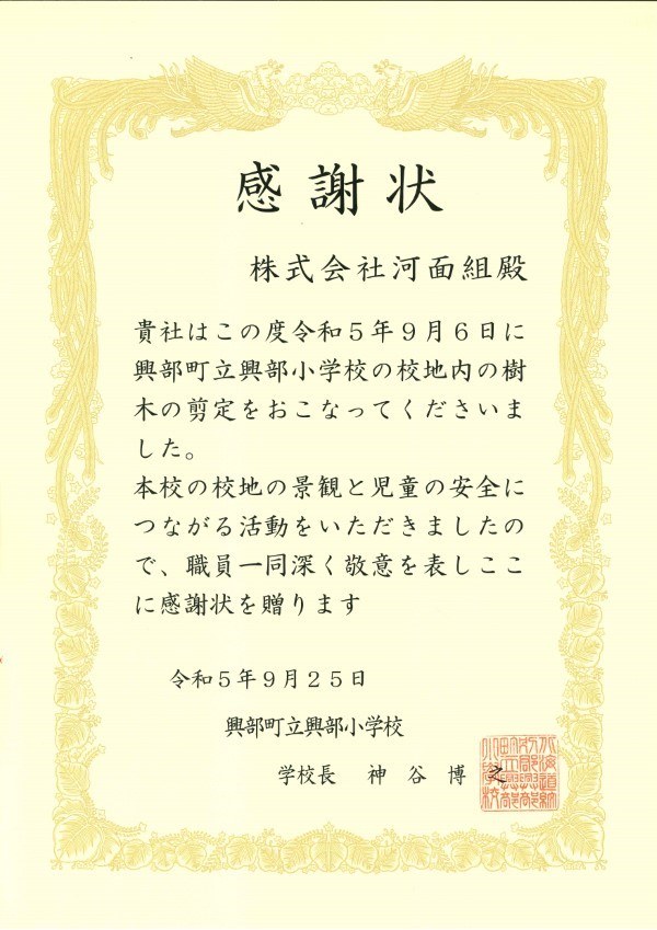 去る9月6日(水)に「興部町立興部小学校」の植樹の剪定をさせていただき、これに伴い9月25日(月)に学校側より感謝状をいただきました。