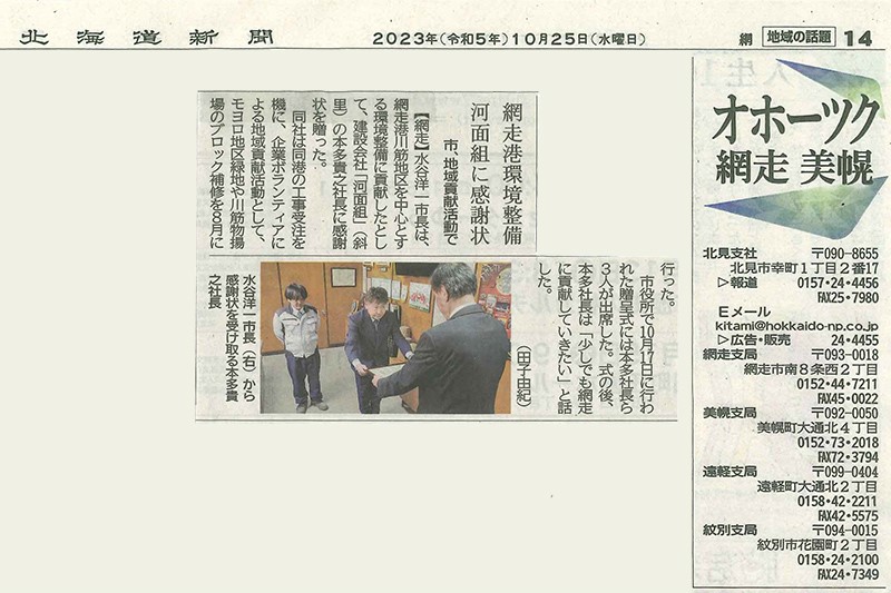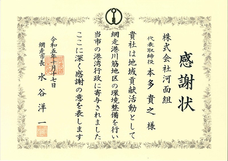 去る10月17日(火)、網走市より網走港川筋地区を中心とする環境整備に貢献したとして感謝状をいただきました。