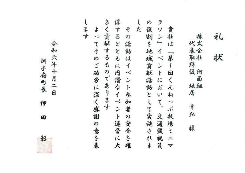 10月2日、訓子府町より9月22日に行われた「第1回くんねっぷ牧場ミニマラソン」のスタッフとして協力、地域貢献活動の感謝状を賜りました。