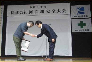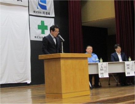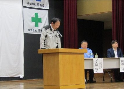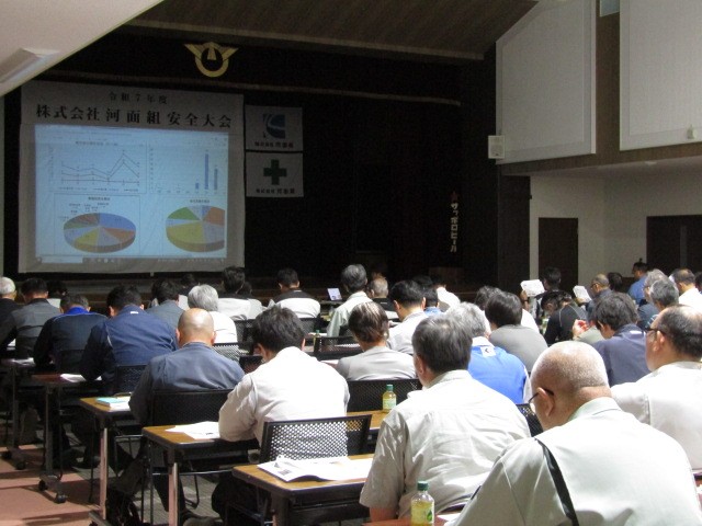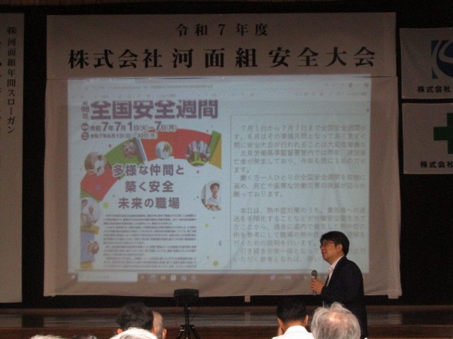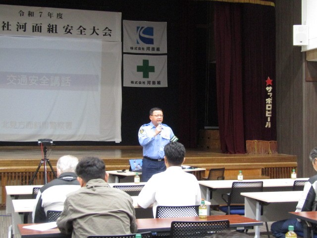 協力会社及び作業員総勢約90余名での安全大会となり、代表挨拶、本部長のスローガン唱和と続き、安全衛生講話として「労働基準監督署安全衛生課長の阿部博様」、「北見方面斜里警察署交通課長の大橋博道様」のお二方より安全衛生にまつわる貴重な講話を頂き、「安全衛生優秀賞」として協力会社2社を称えました。