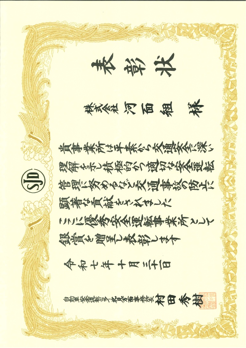「自動車安全運転センター」より優秀安全運転事業所として表彰を受けました。
